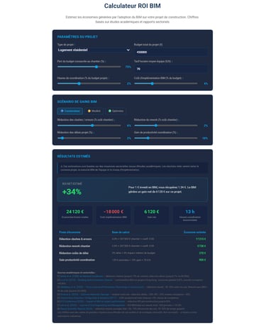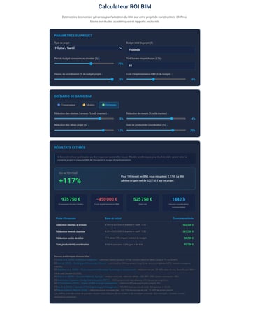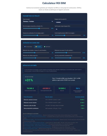 Pour passer des moyennes académiques à un chiffre défendable, il faut injecter les variables de votre projet. C'est exactement ce que fait le calculateur ROI BIM de BIMsmarter.