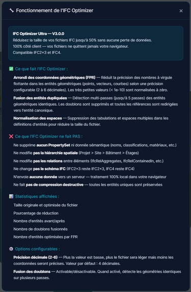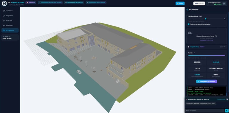 Votre fichier est trop lourd pour être partagé ? Notre optimiseur réduit sa taille de 30 à 50%. La différence avec les autres outils ? La transparence. Contrairement aux "boîtes noires" qui suppriment des données au hasard, ici vous voyez exactement ce qui est minimisé. On touche au gras (géométries sur-tessellées), pas au muscle (la donnée sémantique).