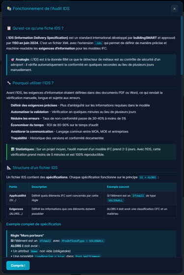 L'audit technique, c'est bien. L'audit contractuel, c'est mieux. L'outil intègre un moteur IDS (Information Delivery Specification).